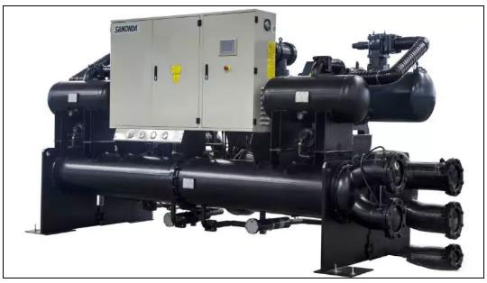 螺杆式冷水机组是以各种形式的螺杆压缩机为主机的冷水机组。它是由螺杆式制冷压缩机、冷凝器、蒸发器、热力膨胀阀、油分离器以及自控元件和仪表等组成的组装式制冷装置。目前,螺杆式冷水机组在我国制冷空调领域内得到越来越广泛的应用,其典型制冷量范围为700~1000kW。
