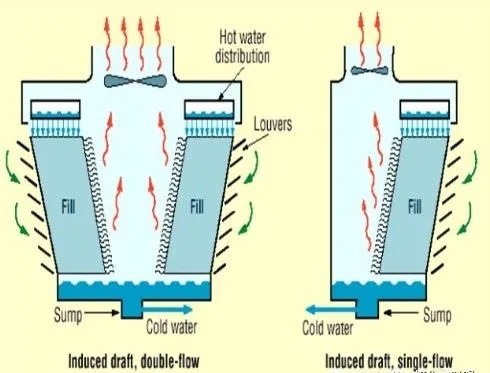 冷却水从顶部进入,流经填料层;空气从一侧或两侧进入,诱导风机使空气横向流过填料层。